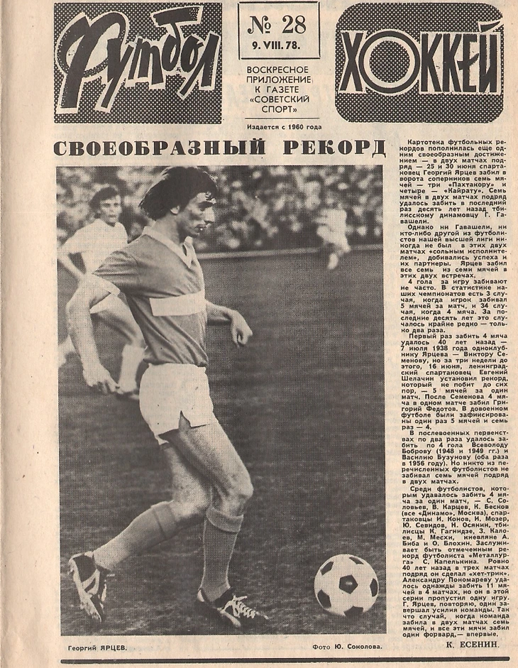 30 июня 1978 года в матче четырнадцатого тура чемпионата СССР Спартаковцы в Москве одержали крупную победу над алма-атинским «Кайратом» — 4:1. Все четыре гола на счету Георгия Ярцева, которому четырежды ассистировал Юрий Гаврилов. Ярцев же за две игры подряд наколотил семь мячей!