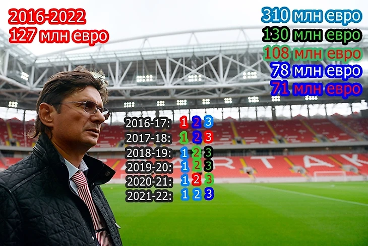 Это трансферные расходы до злосчастного 22-го года, когда российские клубы исключили из всех европейских турниров. Начиная с того самого чемпионского сезона, Федун, как видите, потратил на усиление команды даже меньше своего коллеги Сергея Галицкого. После единственного золота в своей истории Федун смог добиться только одной бронзы и одного серебра. Ни о какой династии даже речи быть не может. Это был сиюминутный успех, благодаря куче обстоятельств подобно успеху Лестера в Англии или Монпелье во Франции.