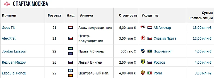 И вот спустя 6 лет парни еще в строю, и на удивление Гус Тил вполне неплохо пылит в родном голландском чемпионате и даже поднял себе ценник - на момент перехода в Спартак его оценивали в 6 млн евро. Понсе год назад за 9 млн евро выкупило хьюстонское Динамо. Ларссон через год после перехода в Спартак взлетел в цене до 15 млн, но потом резко свалился в пике.