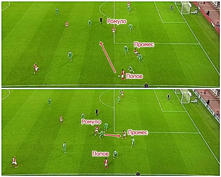 Промес с Поповым красиво комбинируют, а Ромуло ускоряется, открываясь для получения передачи - все по Земанландии, именно атакующий хав, по ситуации Ромуло, и отдает единственный обострящий пас в штрафную на Промеса, а голландец исполнил завершающий этюд блестяще.