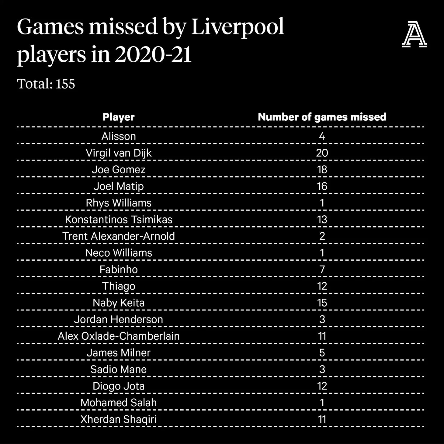 Вирджил ван Дейк возглавляет этот неудачный рейтинг, пропустив на данный момент 20 игр. За ним следуют другие центральные защитники Джо Гомес (18) и Жоэль Матип (16).