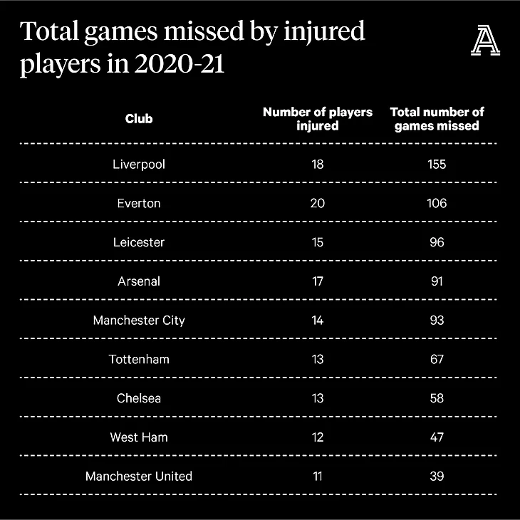 По данным The Athletic, у красных не было 18 игроков из-за травм в общей сложности 155 игр.