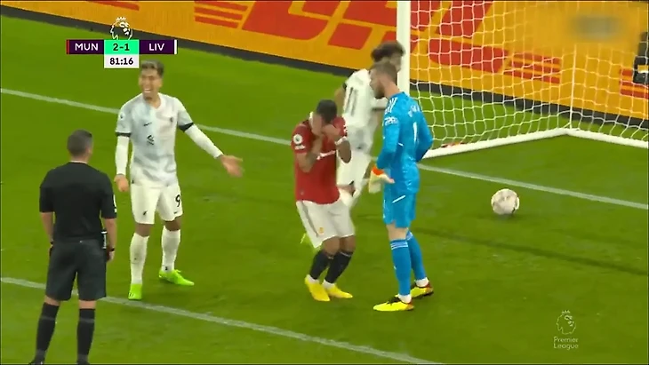 Когда Салах все-таки забрал мяч у Бруну, португалец не смог придумать ничего лучше, чем изобразить что египтянин ударил его по лицу. Арбитр на это не купился.