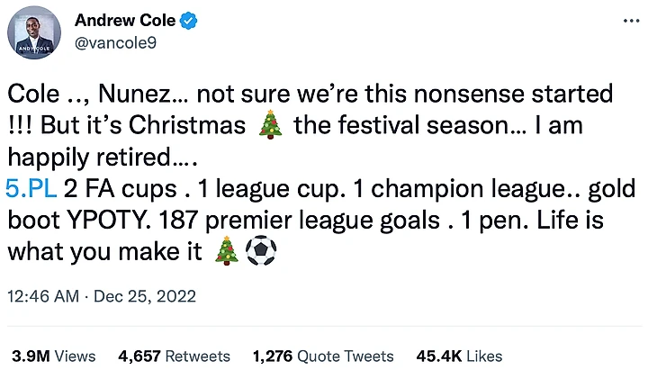 Он написал в Твиттере: «Коул... Нуньес... не верю, что мы начали эту ерунду!!! Но сейчас Рождество, время праздника... Я счастлив на пенсии... пять титулов АПЛ, два Кубка Англии, один Кубок лиги, победа в Лиге чемпионов... приз лучшему молодому игроку года. 187 голов в Премьер-лиге. Жизнь - это то, что ты делаешь».