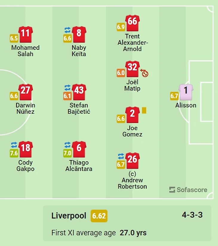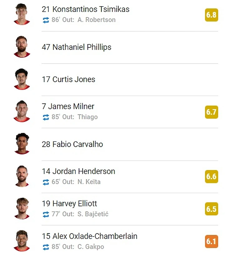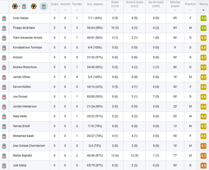 Игроки «Ливерпуля» закономерно получили крайне низкие оценки. Высокий балл получил только Коди Гакпо, который, к сожалению, не отличился результативными действиями, но успевал везде, как в атаке, так и помогая обороне.