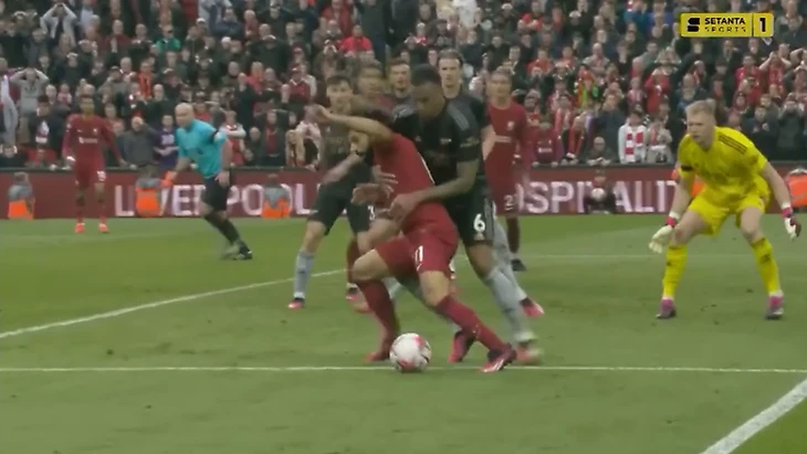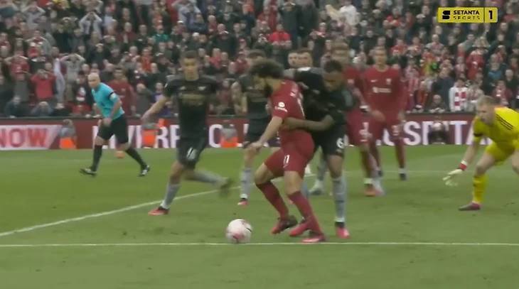 Навязать ему борьбу бросился защитник Габриэл Магальяэс, который пытался остановить форварда не без помощи рук. Сперва он прихватывал египтянина, пытаясь придержать его подальше от ворот, а когда Мо сделал резкое движение, как будто бы дернул его назад.
