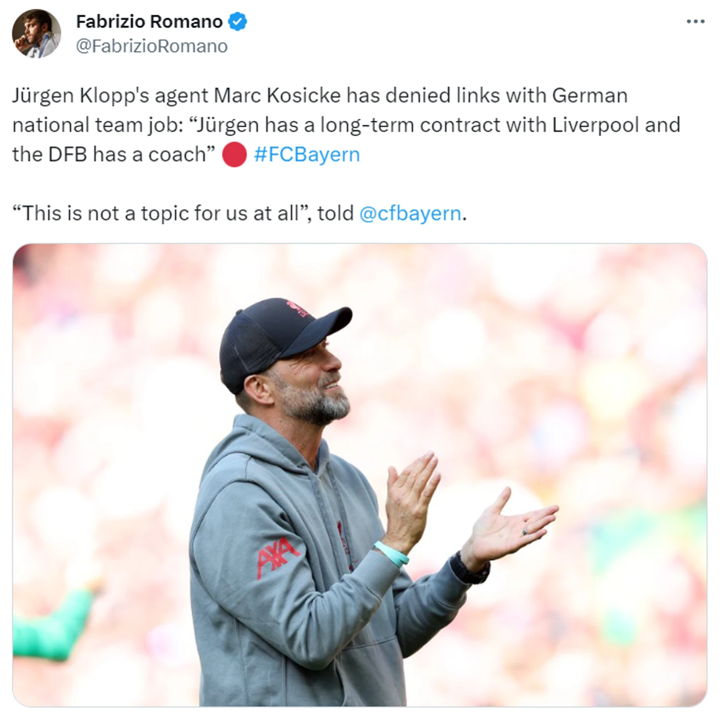 «Агент Клоппа Марк Косике опроверг связь Юргена с должностью главного тренера сборной Германии: «У Юргена долгосрочный контракт с «Ливерпулем», а у сборной Германии есть главный тренер. Сейчас для нас такой вопрос даже не стоит».