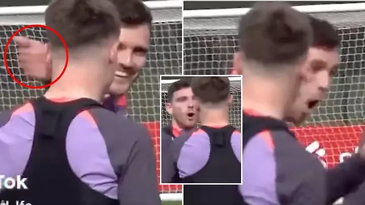 «Ливерпуль» на своих официальных каналах выложил обычное видео тренировочного процесса, но фан-аккаунт клуба заметил одну занятную деталь. Во время подготовки к одному из упражнений 29-летний Эндрю Робертсон хотел подшутить над 17-летним форвардом Беном Доуком и слегка перестарался.
