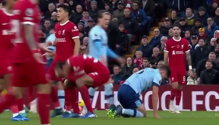 Защитник «Ливерпуля» Жоэль Матип подкатился под хавбека Кристиана Нергора вблизи штрафной и был уверен, что сделал все чисто. Судья матча Пол Тирни решил иначе и зафиксировал фол. Это очень не понравилось камерунцу.