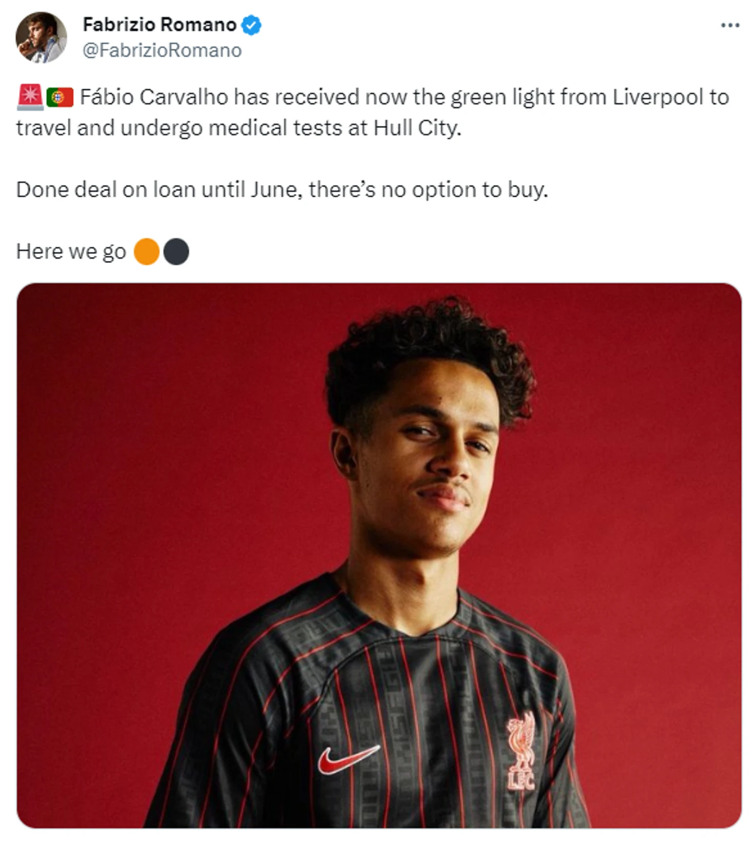 «Фабиу Карвалью получил от «Ливерпуля» разрешение на поездку и прохождение медицинских тестов в «Халл Сити». Сделка по аренде игрока заключена до июня, в соглашении нет пункта о выкупе. Here we go».