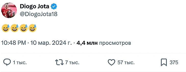 Интернет взорвался, Диогу Жота – кажется, тоже. Уже через несколько секунд после финального свистка твитнул: «😅😅😅😅».