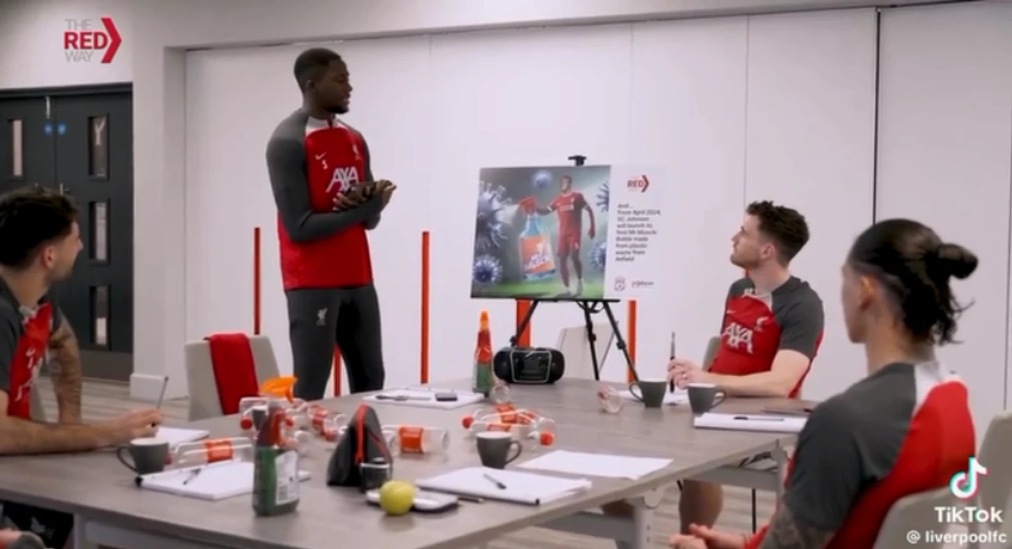 Первым свою идею предложил Ибраима Конате. Он подготовил не только красивые плакаты, но и вдохновляющую музыку, больше похожую на расслабляющую. «Вы знали, что мы тратим 94% нашей энергии на экологичные альтернативы? Мы также согласились сократить количество мусора на наших объектах на 10% каждый год. В апреле 2024 года SC Johnson выпустит первый Mr Muscle из бутылок, собранных на «Энфилде». «Спасибо, Ибу, но это была не совсем идея», − заключил Робертсон.