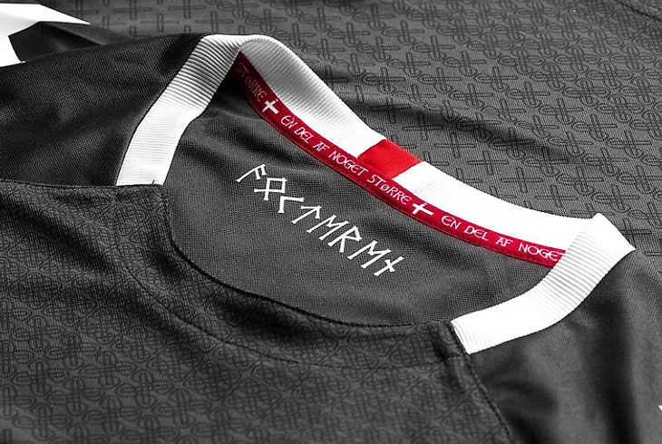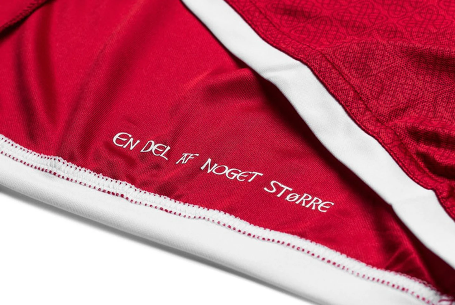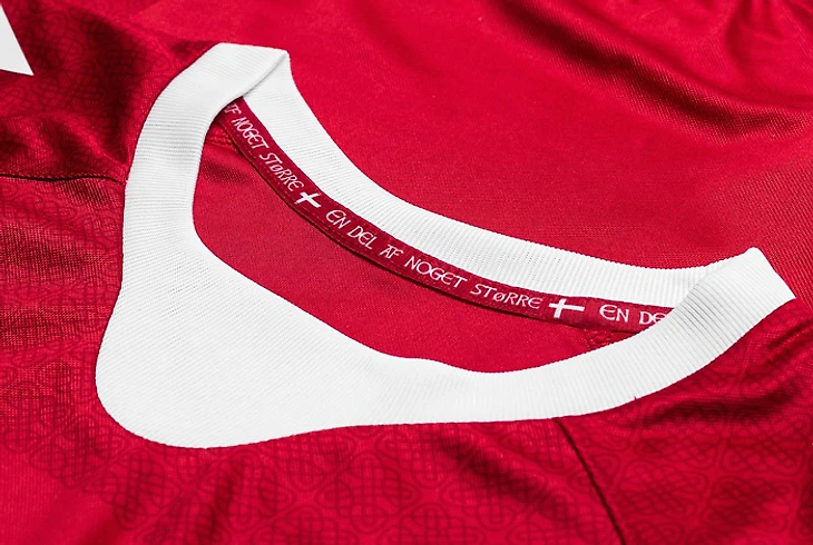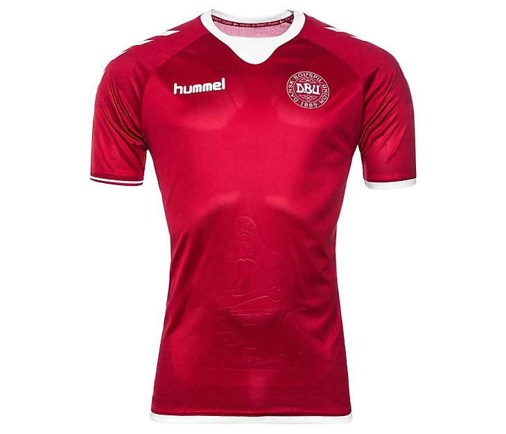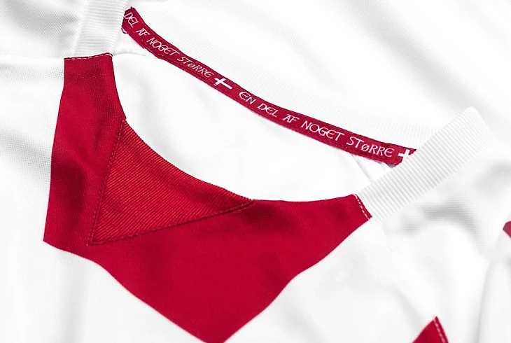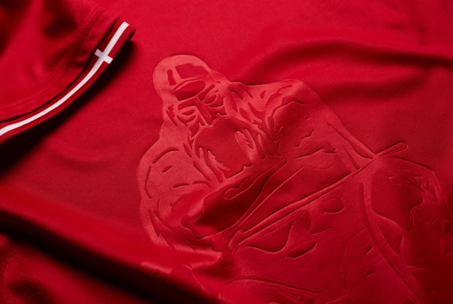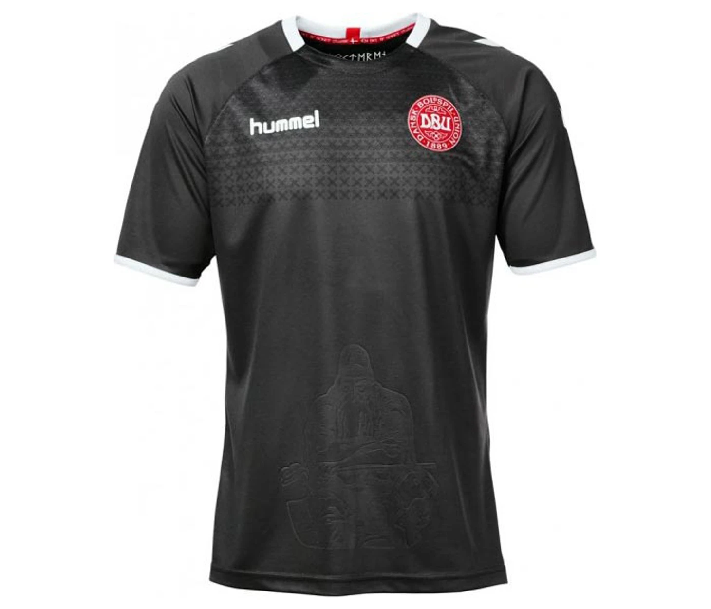 На фронтальной стороне футболки в районе живота, где у футболистов кубики пресса, рельефное изображение легендарного основателя датского государства Хольгера Датчанина. По приданию викинг спит вечным сном, но если над Данией нависнет опасность, пробудится и спасёт свой народ и страну.