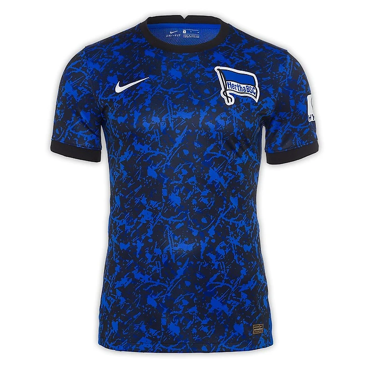Гостевая форма «Герты» 2020-2021 выполнена в черно-синем сочетании цветов с узором в виде брызг от краски. Воротник и манжеты имеют черный цвет.
