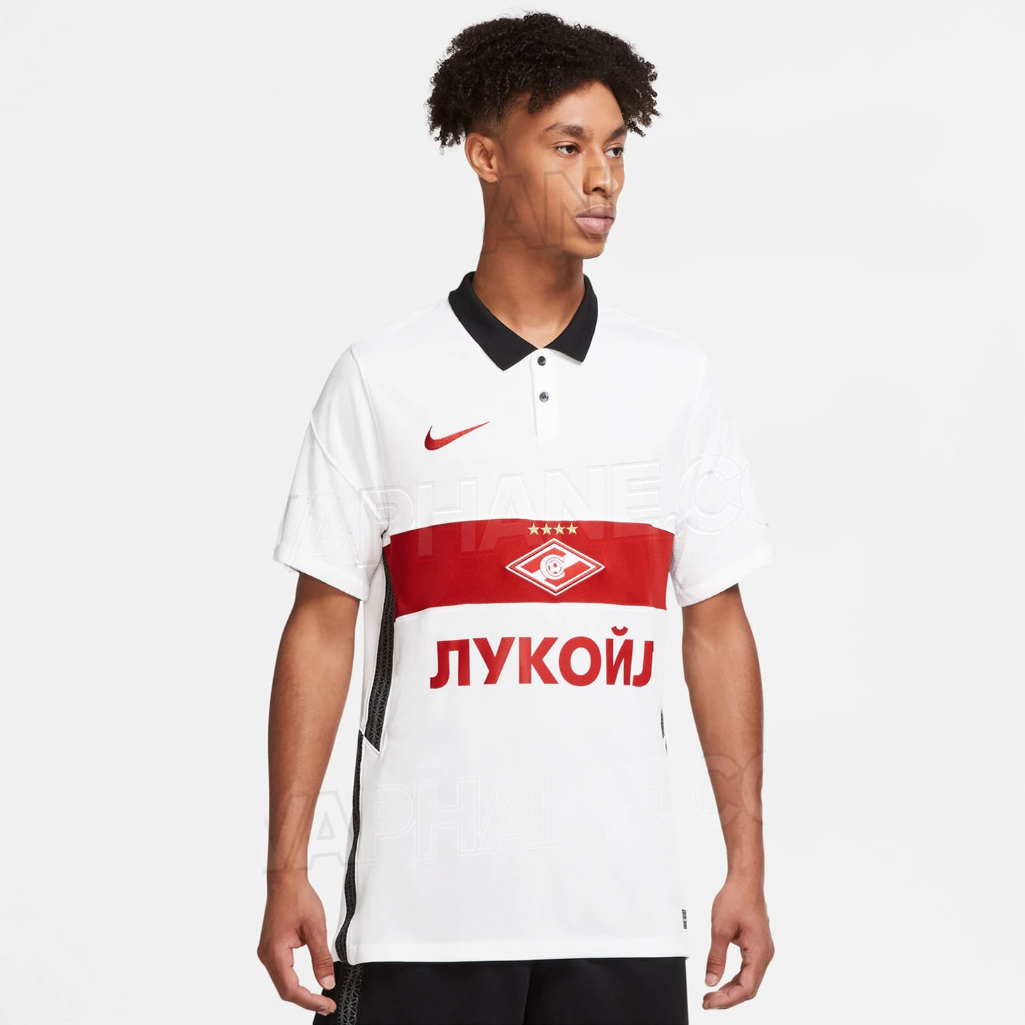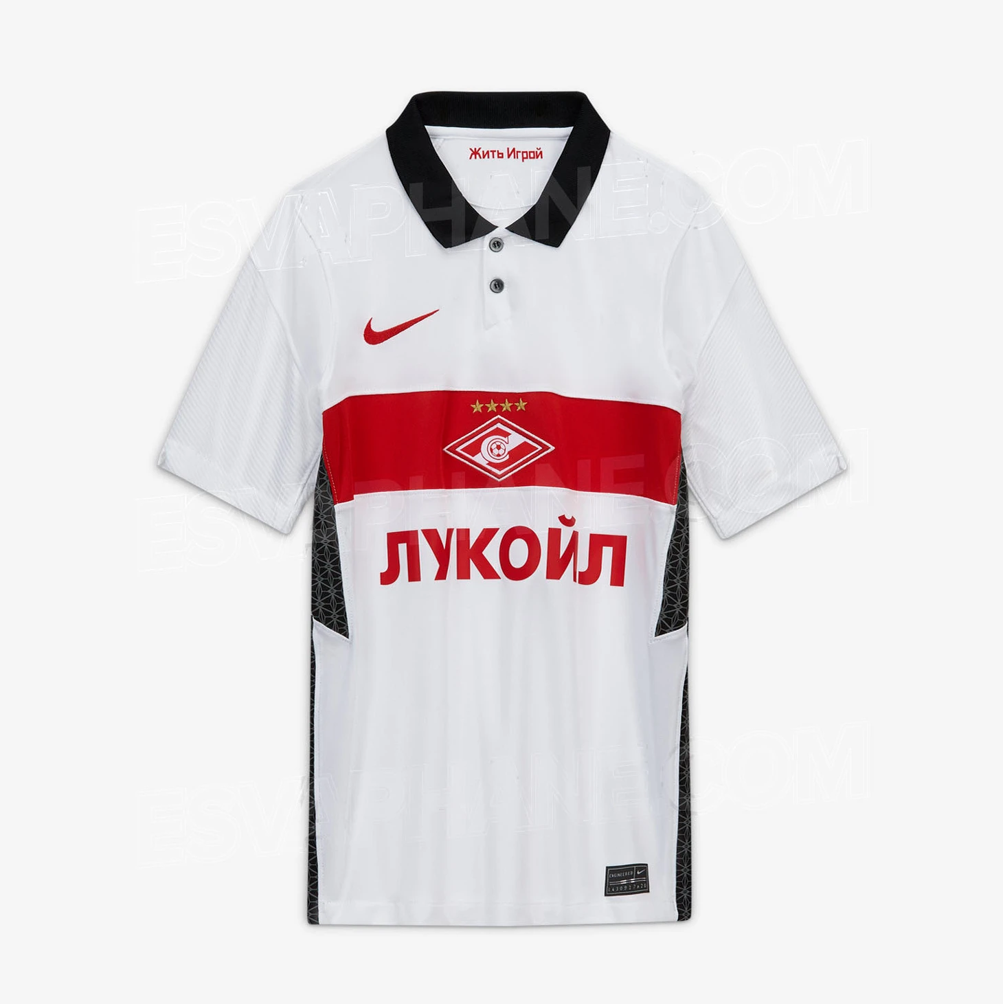 Новая гостевая форма «Спартака» 2020-2021 выполнена в белом цвете с красной горизонтальной полосой, в которую вписан логотип клуба. Воротник имеет стиль поло и выкрашен в черный цвет. Вставки по бокам также черного цвета с узором.