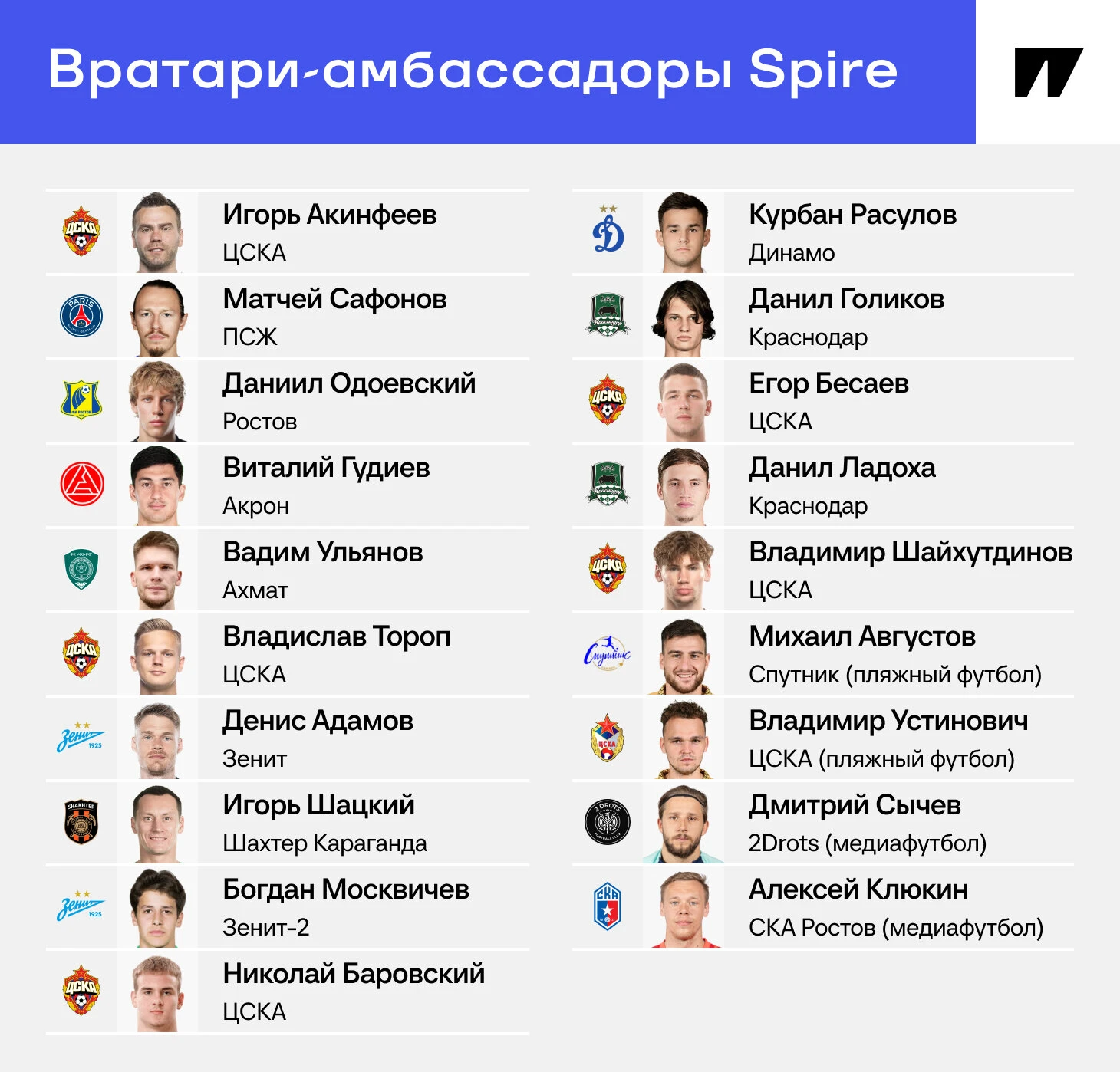 У Spire много вратарей-амбассадоров: Акинфеев, Сафонов, Виталий Гудиев («Акрон»), Вадим Ульянов («Ахмат»), Владислав Тороп (ЦСКА), Денис Адамов («Зенит»), Даниил Одоевский («Ростов») и другие.