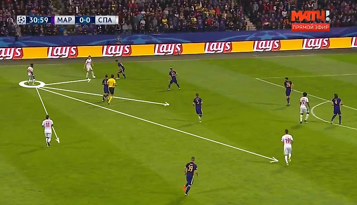 Что мы видим, имеем? Самедов и Промес чуть ниже. Адриано на острие. Любой из них может открыться за спины, при этом кто-то под передачу. Сам бразилец может отскочить и обыграться с партнёрами в стеночку, создать за спиной свободную зону. Это интересно. Тем более, что Промес и Самедов достаточно креативные игроки. И при таком расположении потенциал атаки растёт в разы. Есть вариант сразу нескольких треугольников-квадратов.