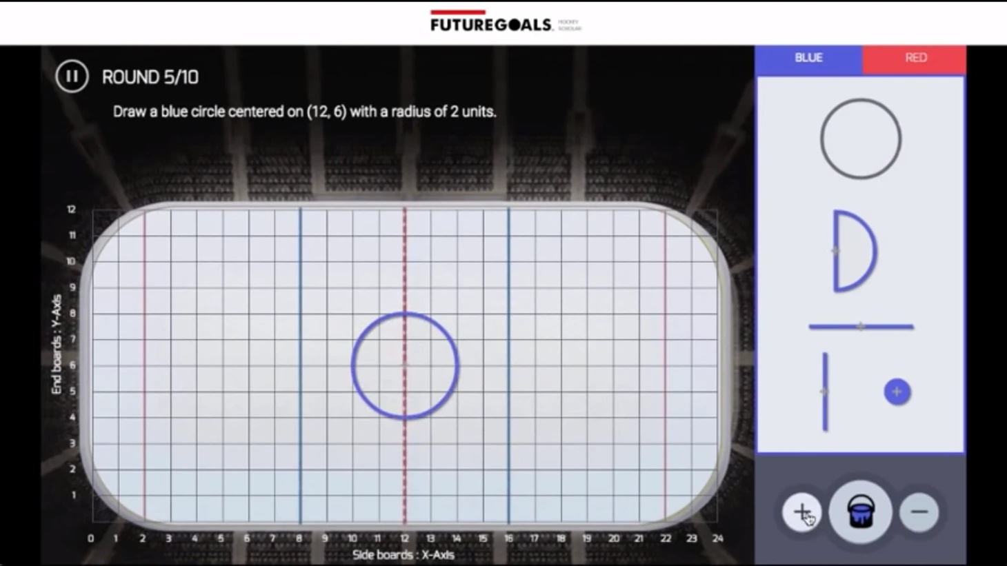 На первом занятии ученики проходят основы геометрии – как находить площади различных фигур, некоторые теоремы и так далее. Например, школьники пытаются вычислить площадь центрального круга, его диаметр и сколько шагов нужно хоккеисту, чтобы его преодолеть.