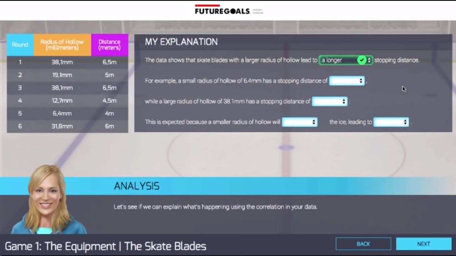 Самая сложная часть – про «клюшки и вратарскую амуницию». Школьники изучают с какой скоростью летит шайба после броска и почему у нее такая траектория. Затем они рассчитывают, как положение хоккеиста, его замах и амплитуда повлияли на полет. Программа дает задание – поставить «хоккеиста» в такое положение, чтобы шайба после броска попала, например, в «девятку». Учитывается все: движение рук, скорость паса, сила броска, рост «игрока» и даже прочность клюшки.