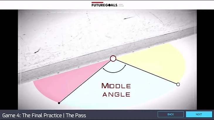 На втором занятии необходимо раскрасить лед. Дается чистый прямоугольник и надо превратить его в хоккейную площадку, учитывая размеры всех элементов и участков. Этот урок помогает школьникам освоить координатную ось, базовые законы о линиях, лучах и прямых. На следующем уроке школьники обучаются «пасам от борта», то есть, изучают углы.