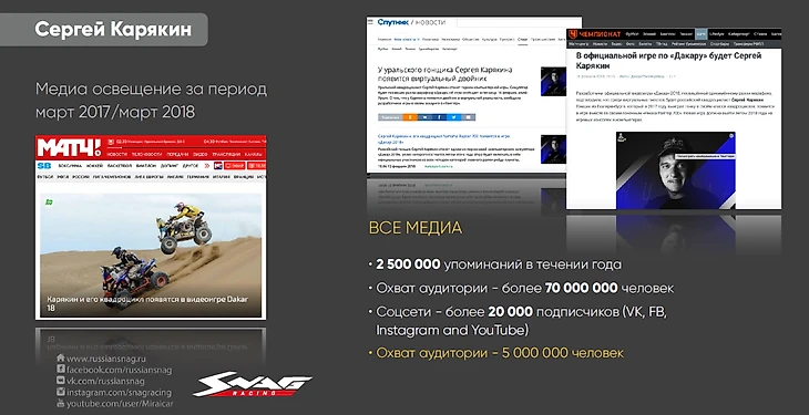 Есть два подхода к спонсорству: престиж и медиаохват. Во второй путь в России никто особо не верит. Я могу говорить потенциальным партнерам, что, вложив в меня ₽5 млн, они получат медиарекламы на ₽15 млн. Это даже будет правда, если считать media value. Но у нас это мало кого интересует, нет той культуры, что нарабатывалась в Европе и Америке десятки лет. Честно могу сказать: в России такая система не работает, и спонсорам нужен имидж, престиж. Мне помогает имя, которое у меня появилось после победы на «Дакаре». Но и в этом случае главное – выход на первых лиц компаний. Потому что они очень занятые люди, и информацию им надо доносить максимально точно и полно. Если все грамотно объяснить, они будут готовы помогать. Яркий пример – сотрудничество с компанией «Форес». Ей руководит мой знакомый, с которым мы еще в детстве вместе катались на квадроциклах. Он любит спорт и захотел помочь российскому гонщику участвовать в «Дакаре». Эта компания поддержала меня как раз перед победой 2017 года, а сейчас «Форес» – мой генеральный партнер, мы сотрудничаем гораздо масштабнее, чем раньше. И все равно нет такого, что я просто говорю «Дайте денег». Когда задействованы личные отношения ответственности даже больше. Я беру у человека деньги, смотря в глаза, и мне потом отчитываться. Никто не платит просто так. Моя команда не стоит на месте: у нас есть пресс-секретари, фотографы, операторы. Мы пополняем канал на Youtube, ведем соцсети, я постоянно появляюсь в СМИ, упоминаю спонсоров.
