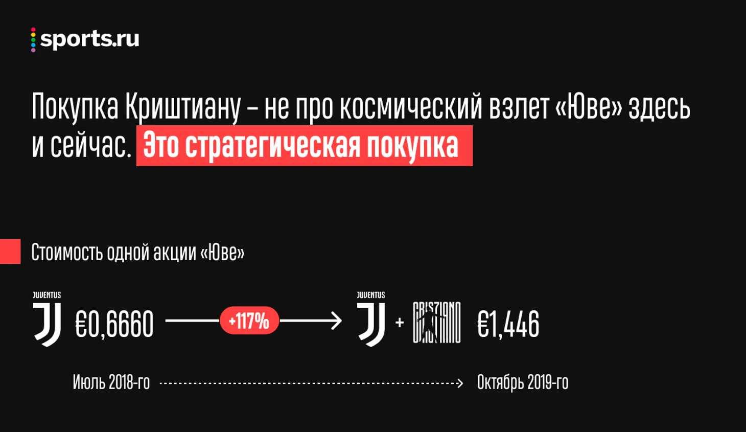 По состоянию на 2 июля 2018-го, за неделю до трансфера Криштиану, одна акция «Юве» стоила 0,666 евро – теперь на 117% больше. Рыночная капитализация достигла почти 1,5 миллиарда.