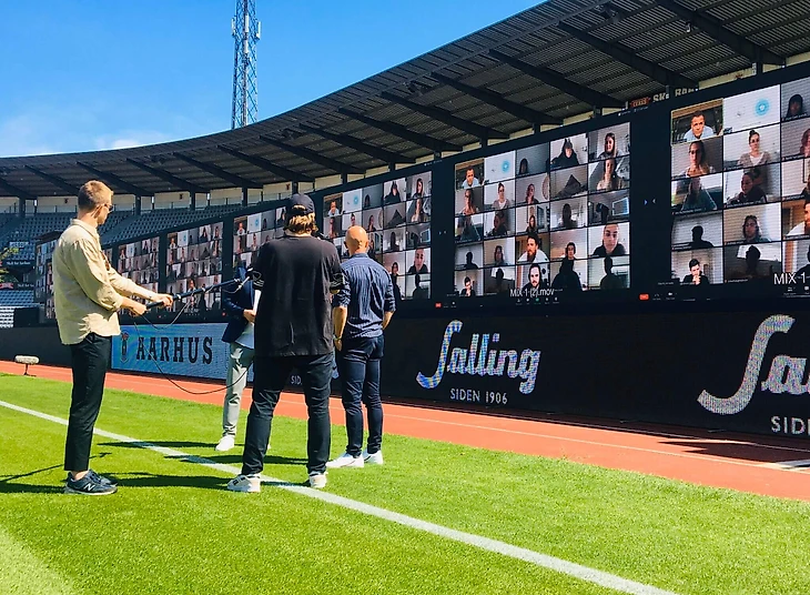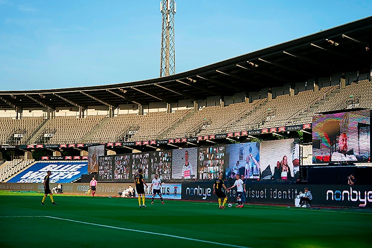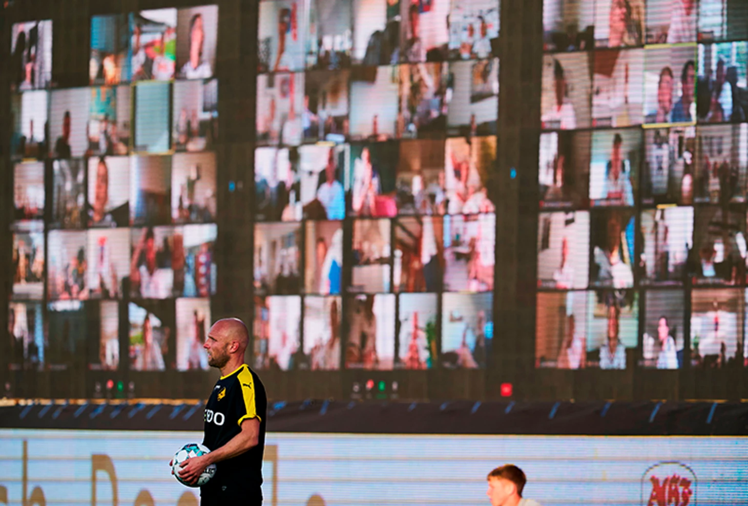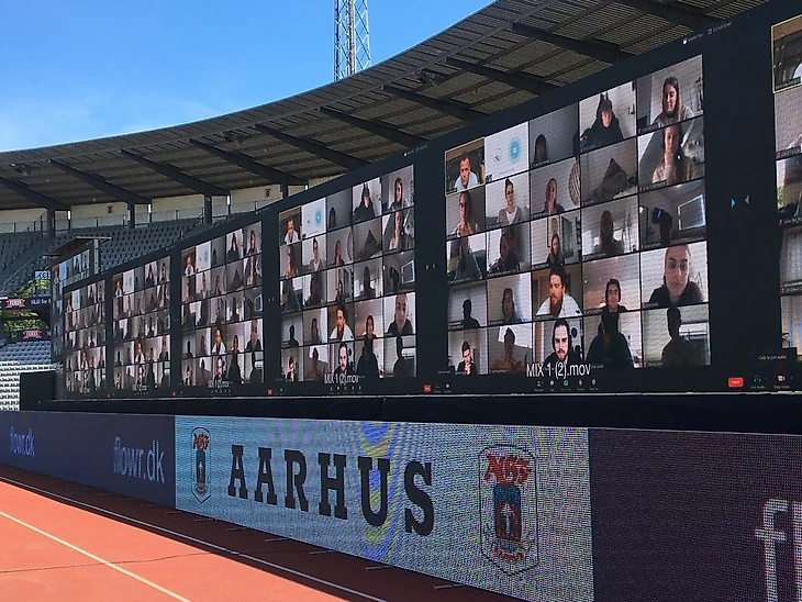 Каждое – персональная ссылка в Zoom-конференцию: болельщики подключились, их изображения вывели на экран площадью 120 квадратных метров, которым перекрыли пустую трибуну. Одновременно туда выводили по 200 видео, они менялись по кругу. Две трети пространства отдали болельщикам «Орхуса», треть – нейтральным зрителям.