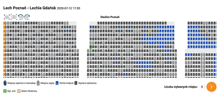 Доступные билеты на матч «Лех» – «Лехия», который пройдет 12 июля: по фигуркам людей видны брони компаний из трех-четырех и даже пяти человек