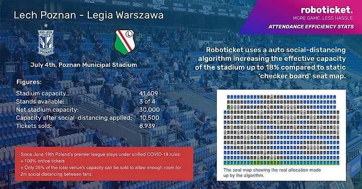 Разберемся на примере «Леха» из Познани – клуба, с которым Roboticket работает плотнее всего. У клуба стадион на 41 000 зрителей, допустимая вместимость сейчас – около 10 500 мест. «Лех» открыл три трибуны из четырех (формальный максимум снизился примерно до 7500 зрителей), но продал на матч с «Легией» в начале июля 8939 билетов.