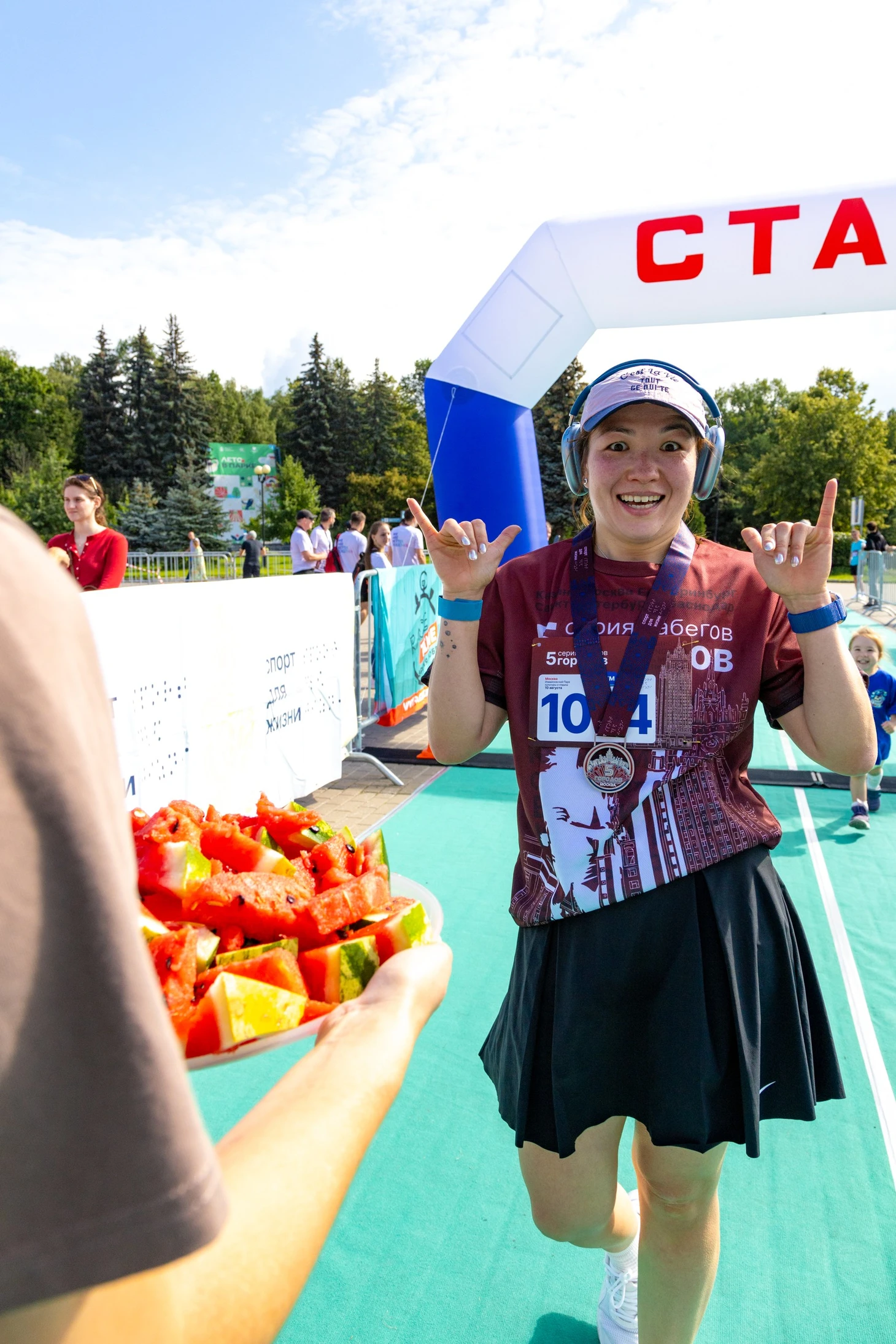 В забеге «5 городов», по традиции, участвовали и взрослые, и дети, на дистанциях от 50 метров до 5 км (для детей) и от 2 км до 21,1 км (для взрослых). В рамках мероприятия также прошел забег «Вслепую» — авторская идея фонда «Спорт для Жизни». На этой дистанции участники бегут парами: один – с маской на глазах, пробуя себя в роли незрячего бегуна, второй выступает волонтером-лидером, можно меняться ролями. На финише участников ждал уже ставший доброй традицией сюрприз: сочные арбузы из холодного бассейна — лучший способ освежиться после забега!