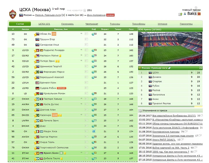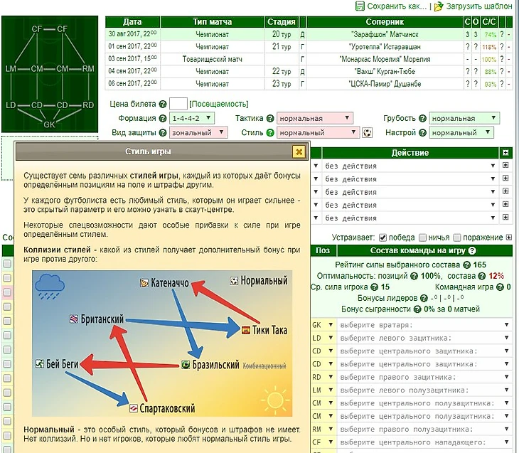 Что в нем такого интересного? Во-первых, реальные игроки – к этому проект пришел несколько лет назад. Реальные игроки теперь ценятся, дают прибавку к силе, хоть и не огромную. Во-вторых, простота гейм-плея: отправляешь тактику, состав, ставишь цену на билет – ничего сложного. В-третьих, система коллизий: ставишь британский стиль игры, попадаешься на спартаковский и соперник получает преимущество – коллизию выиграл он, а если противник ставит тики-таку, то уже бонус твой. В-четвертых, система специальных возможностей для игроков, увеличивающих силу в зависимости от стиля.