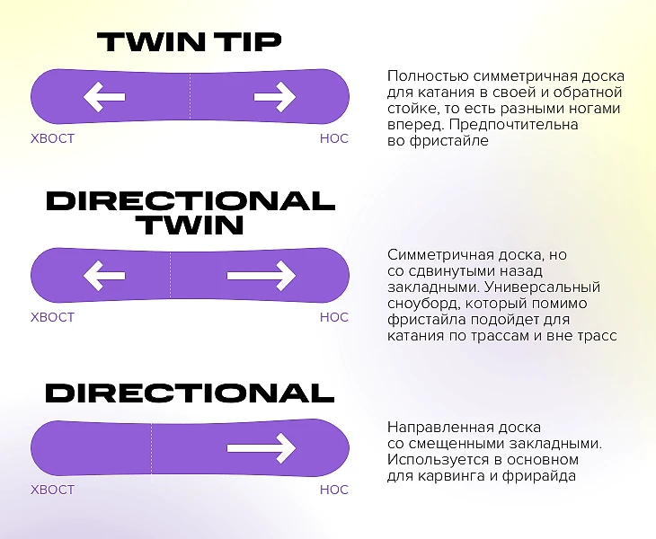 Twin-directional – симметричная доска со смещенными на 10-20 мм назад закладными. Либо ее вариация с направленной жесткостью, где нос более мягкий, а хвост – жесткий.