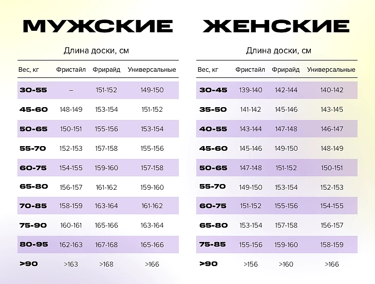 Также учитывайте, что доски различаются по ширине талии. Если у вас небольшой размер ноги, то это одна доска, а если, допустим, 46-47, то нужно брать wide-доску в той же ростовке. Это информация есть в базовом описании сноуборда и таблицах подбора.