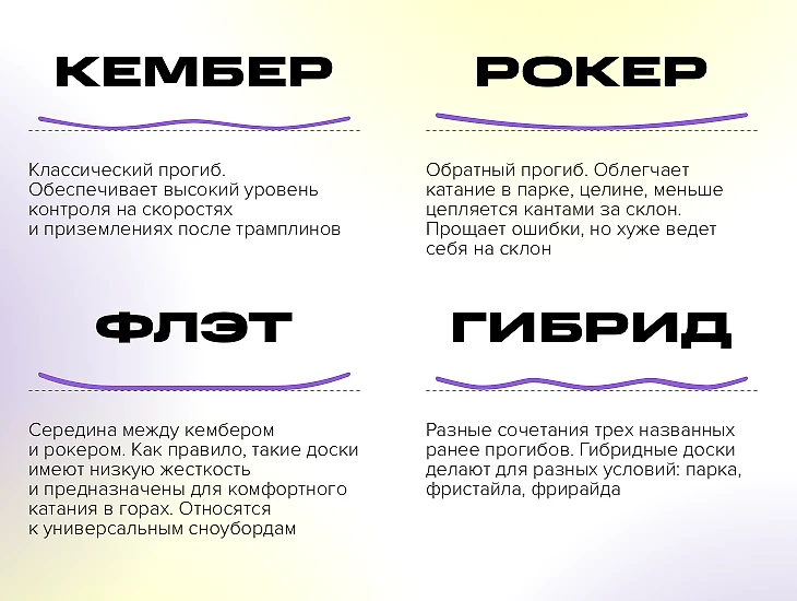 Если говорить про прогибы (которые влияют на поведение сноуборда), то я бы рекомендовал смотреть в сторону классических досок с кембером (традиционный весовой прогиб, где самая высокая точка доски находится посередине – прим. Sports.ru).