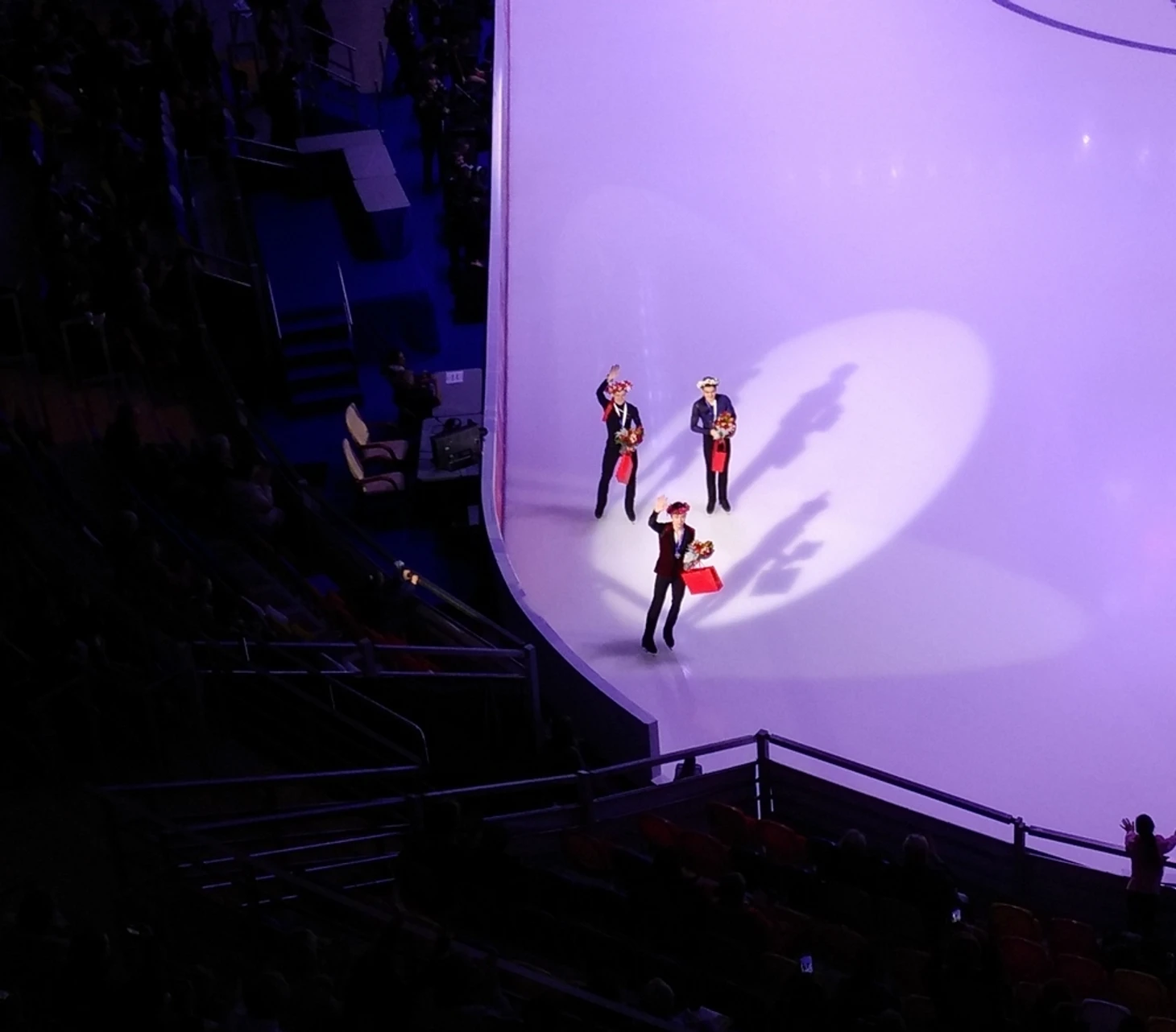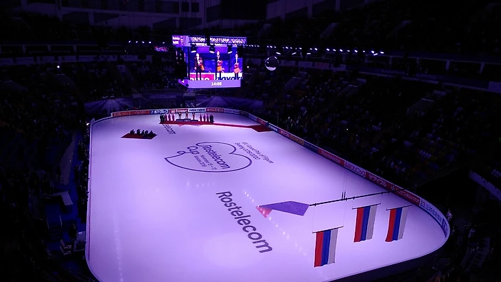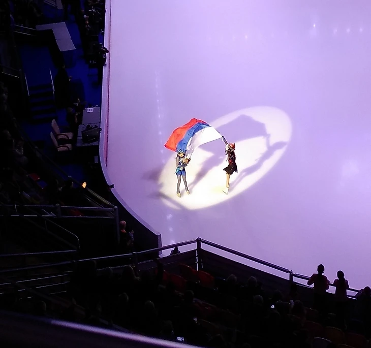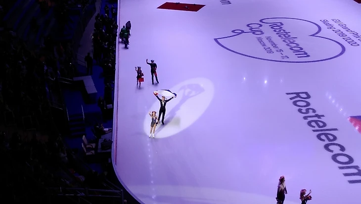 По телеку, как я уже говорил, всё в основном показывают крупным планом. А с трибуны можно кое-что и интересное заприметить. Сначала по программе были награждения, гимны и фотосессии спортсменов. В одной такой фотосессии Медведева и Трусова с флагом взяли под своё крыло Марайю Белл. Но российский паспорт вручить американке не успели, она сбежала. А вообще, было приятно, что Саша и Женя на награждении держались вместе. За флаг. Ну и, конечно, интересное фото получилось, когда Дмитрий Козловский из золотых медалей делал ушки своей партнёрше Александре Бойковой.