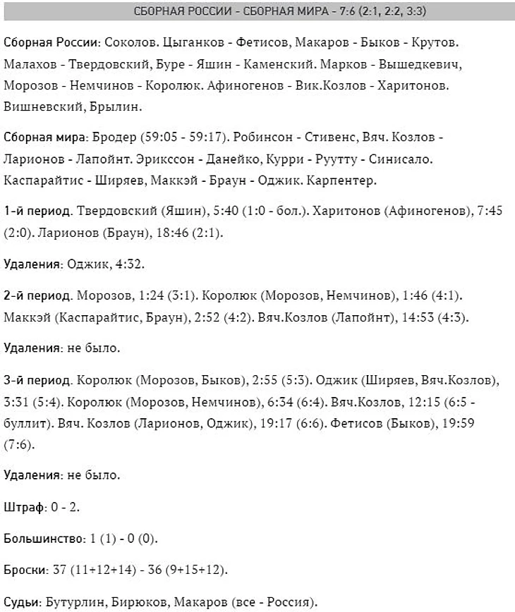Тем удивительнее, что впервые успех праздновала сборная Мира, с вполне приличным (по нынешним меркам), но разгромным счётом 9-4! Главный тренер "мира" Скотти Боумен пошел по накатанной дорожке и сделал ставку на россиян (в стартовых составах, к слову, "наших" не было). И россияне не подвели - звено братьев Буре стало лучшим, вкупе с Юшкевичем сообразило 4 гола, 3 из которых на счету Павла. "Русская ракета" стал первым российским и вторым европейцем (вслед за Селянне 98) самым ценным игроком МВЗ. А "братская" связка поучаствовала в голе на "матче звезд" впервые со времен братьев Ришаров (времена братьев Стаал и Сединов были еще впереди). Младший брат, Валерий в интервью, по заслугам, раздавал хвалебные отзывы в адрес Павла: