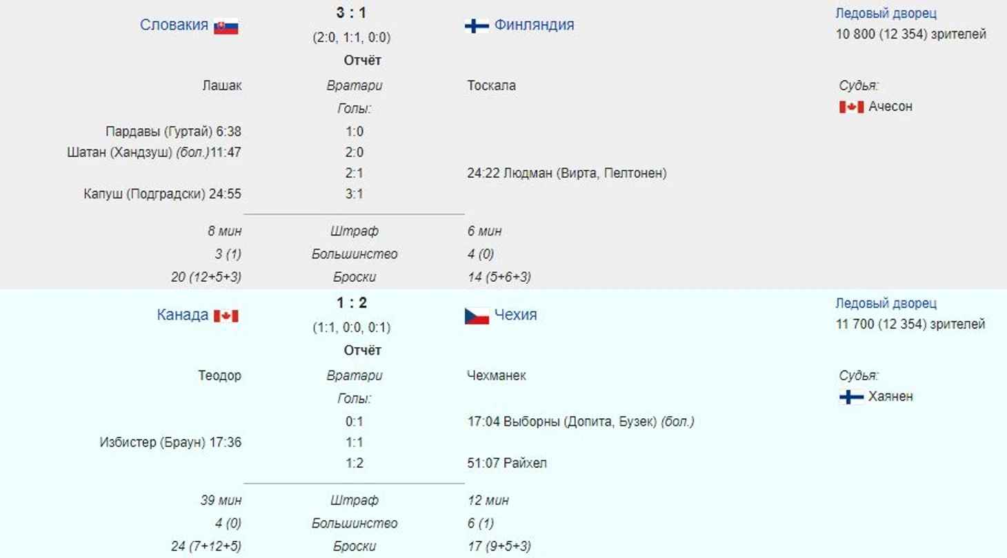 В первом матче 1/2 финала словаки, вопреки ожиданиям финской многотысячной группы поддержки, собравшейся на трибунах "Ледового", дерзко и уверенно обыграли команду Нико Капанена и Олли Йокинена. А во втором полуфинале более опытные чешские хоккеисты (6 олимпийских чемпионов Нагано-98) взяли верх над весьма средним канадским составом, который и звёзд с неба не хватал, но и мальчиками для битья не выглядел.