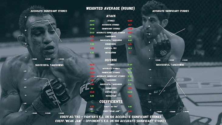 Посмотрим на то, какая вероятность стать лидером в том или ином показателе по результатам 3 раундов? Напомню, что нас интересует исходя из коэф. корреляции три показателя: точные акцентированные удары, успешные тейкдауны, попытки болевого приема. Мы видим, что в 2 из 3 показателей шансы равны и только по успешным тейкдаунам у Дариуша преимущество. Отсюда и шансы на победу. Бойцы равны, но только у Дариуша чуть выше шансы в показателях борьбы. Посмотрим на средневзвешенные показатели и динамику бойцов в 3 раундах.