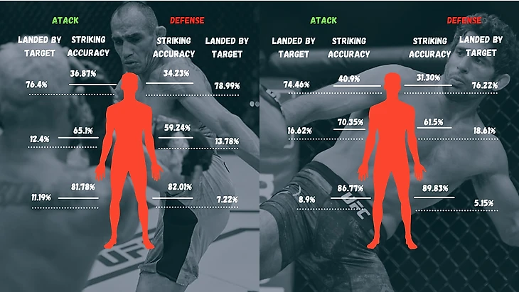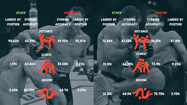 Как, куда и с какой точностью наносят удары бойцы и их соперники. Явное доминирование ударов на дистанции у Фергюсона в данном поединке не идет ему в плюс. Опять же я не нашел значимой стат. зависимости между ударами и набранными очками у Дариуша. Так что, делать упор на дистанционном поединке мне кажется не совсем разумным. Хотя... Шансы 50 на 50 в ТАУ...