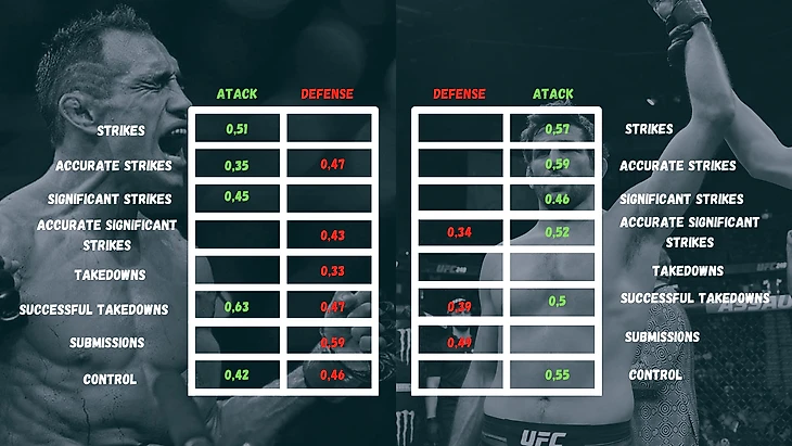 На какие следует показатели обращать наибольшее внимание? Фергюсон набирает очки за счет ударов ( не точных, не акцентированных, а просто ударов), успешных тейкдаунов и контроля соперника. Такой же список опций и у Дариуша. Но способы того, как их соперники набирали очки кардинально разнятся. У Дариуша это точные акцентированные удары (у Фергюсона я не нашел значимой стат. зависимости в этом показателе), успешные тейкдауны (Тони набирает на них очки) и болевые приемы (у Фергюсона нет стат. зависимости в этом показателе). То есть успешно набрать очки через удары у Фергюсона вряд ли получится.