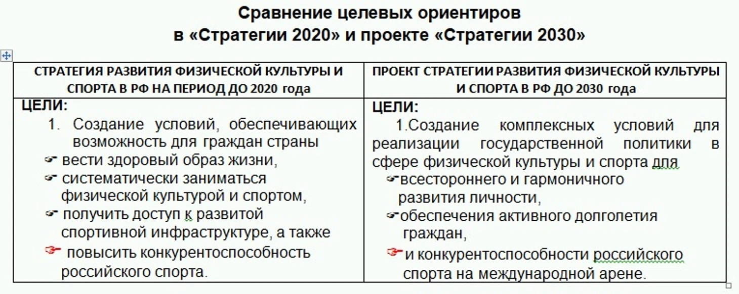 а). Отсутствие преемственности целей «Стратегии 2030» относительно предшествующей «Стратегии 2020», кроме одной «переходной» цели - обеспечения «конкурентоспособности российского спорта на международной арене».