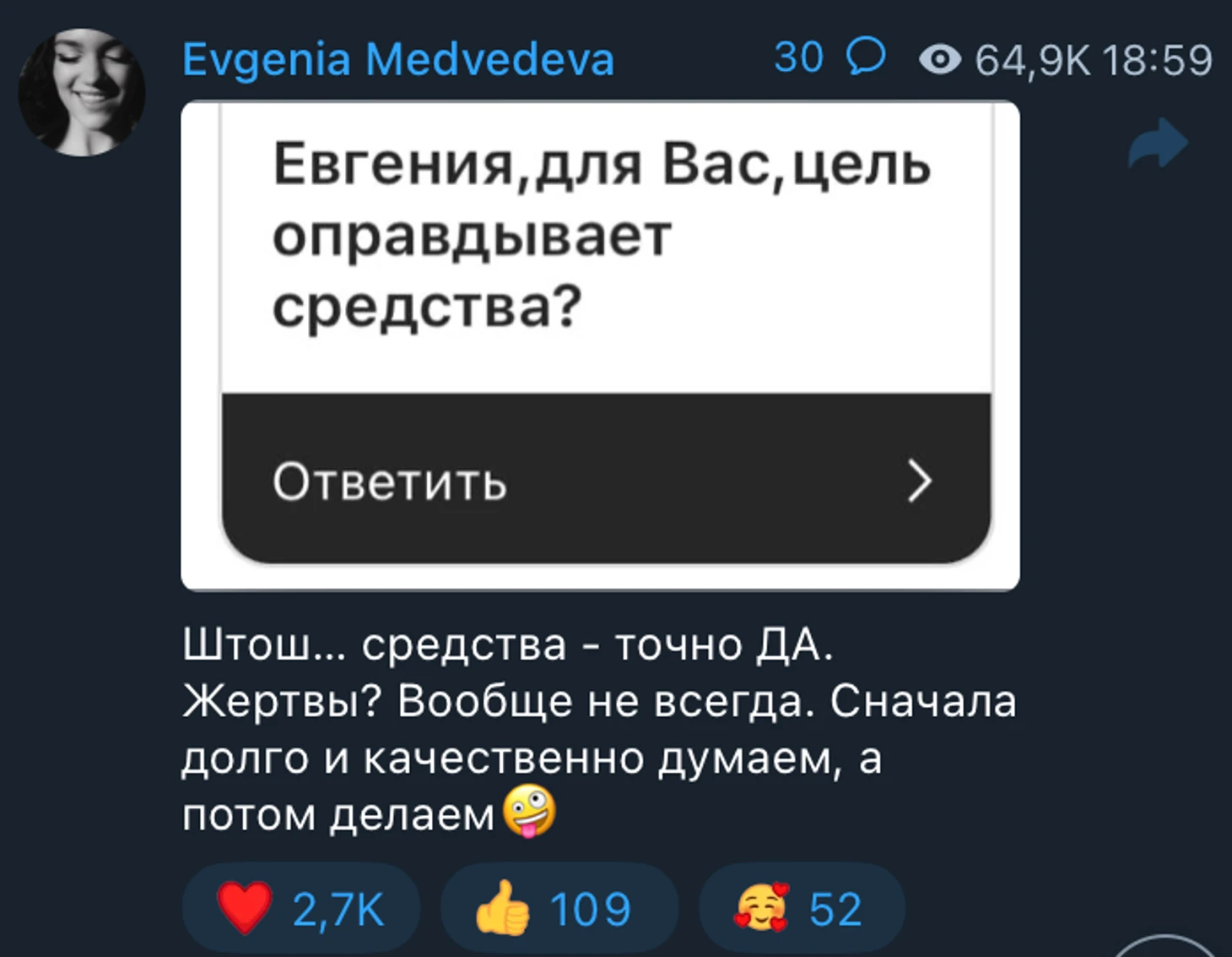 Серебряная призерка олимпийских игр Евгения Медведева в своем телеграмм-канале ответила на некоторые вопросы подписчиков.