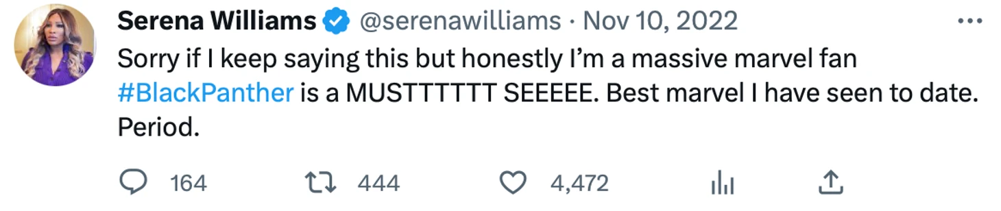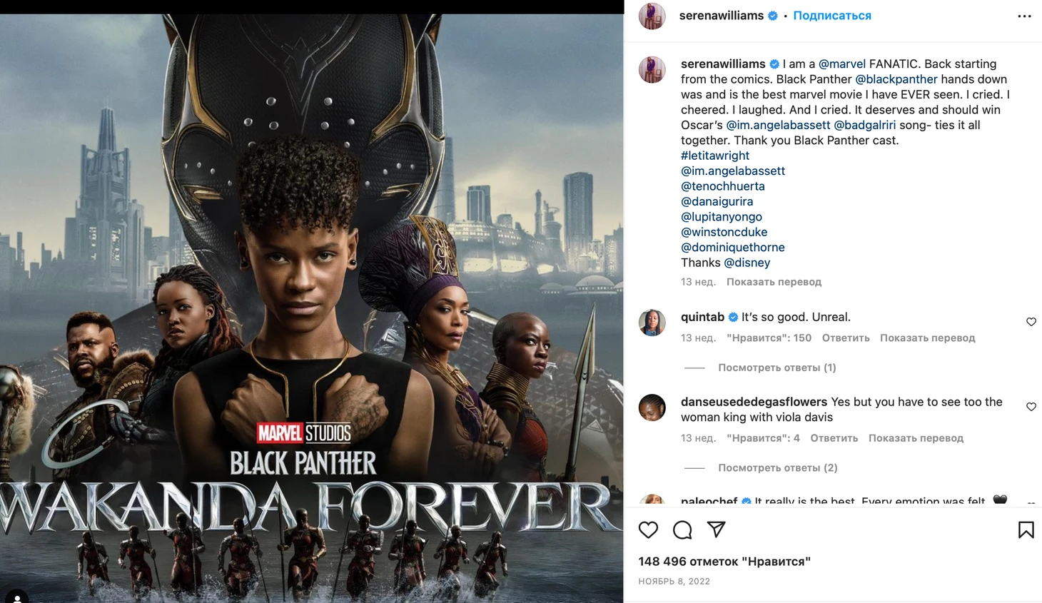 Серена назвала себя огромной поклонницей Рианны, добавив, что не может дождаться, когда она выступит вживую после такого долгого времени. 23-кратная чемпионка турниров «Большого шлема» надеется, что певица исполнит песню «Lift Me Up», которую она спела для фильма «Чёрная Пантера: Ваканда навеки».