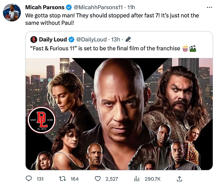 Звезда американского футбола Майка Парсонс пожаловался в соцсетях на создателей кинофраншизы «Форсаж».