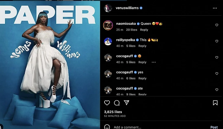 Уильямс поделилась фото обложки журнала в своем аккаунте в социальных сетях. Пост привлек внимание со стороны коллег-теннисистов, которые оставили множество комплиментов девушке и даже сделали репост поста.