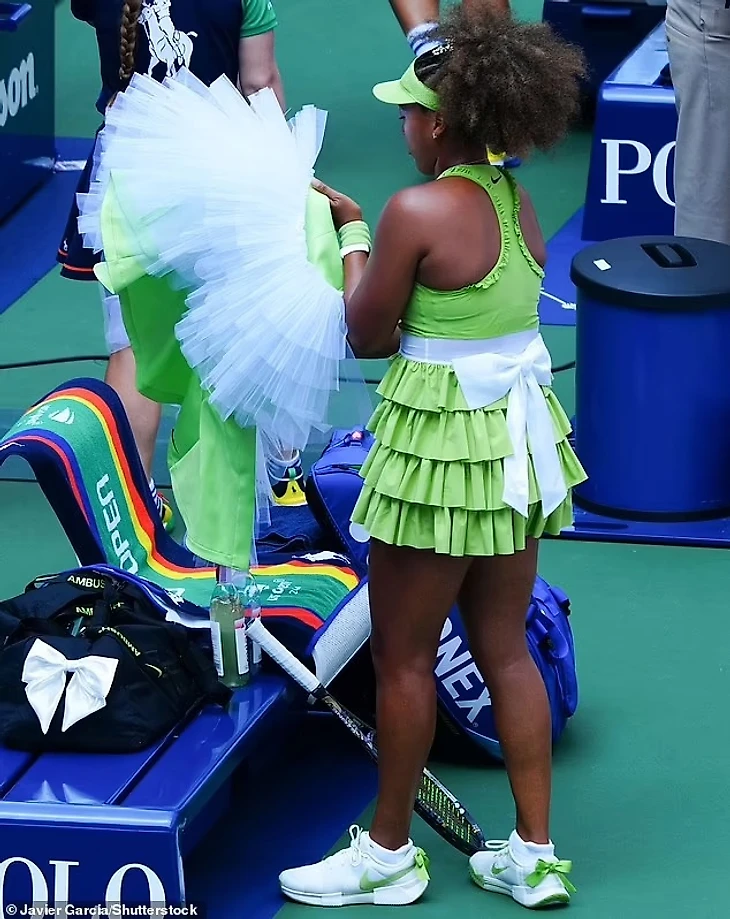 На разминке Осака была одета в белый пиджак с большим зеленым бантом и белую пачку, но для матча переоделась.