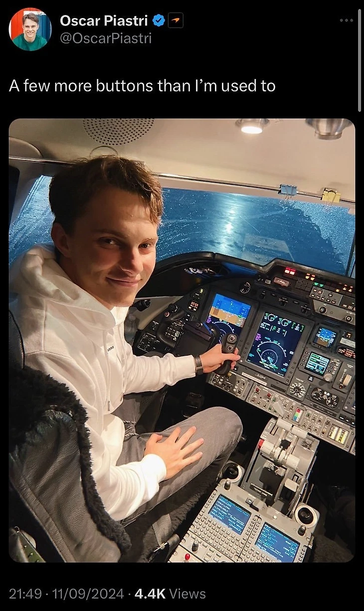 Пилот «Макларена» опубликовал фото из кабины самолета, подписав: «Тут на несколько кнопок больше, чем я привык».