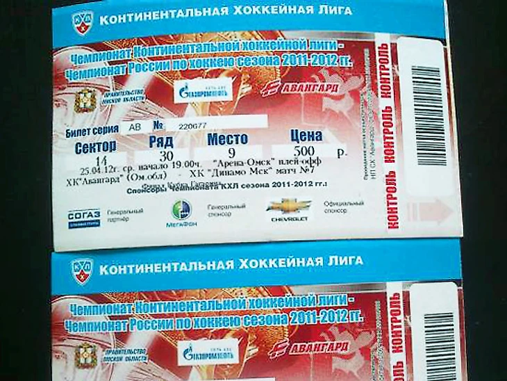 Здорово, правда? Такую не стыдно и в офисе поставить. Это, между прочим, билет с матча финала Кубка Стэнли, когда Короли умыли Дьволов. Билет сделан крепко — шрифты, вёрстка и бумага на уровне. Что же у нас, в «родном колхозе»? Вот билеты на финальный матч Авангард–Динамо: