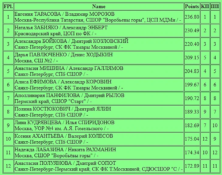 На 11 и 12 месте также две юниорские пары Надежда Лабазина/Никита Рахманин и Анастасия Полуянова/Дмитрий Сопот. Возможно, что у этих ребят пока получается далеко не все, но даже с таких мест на ЧР они вполне могут быть конкурентоспособными на международной арене.