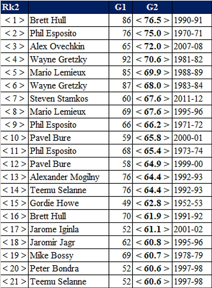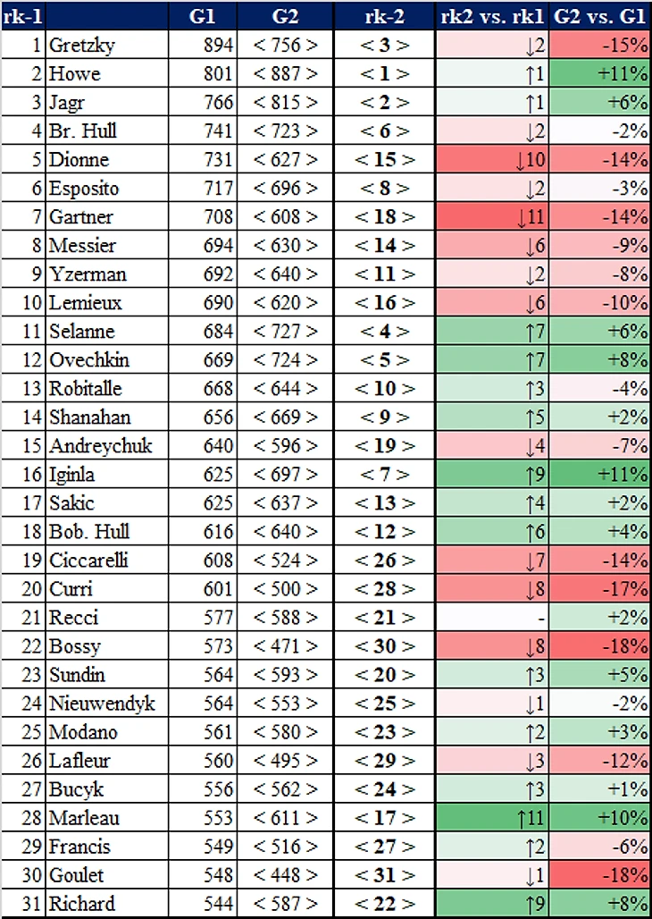 Сразу оговорюсь, что этот подход не учитывает, что большую часть карьеры Горди Хоу было всего 70 матчей в регулярке, а у Гретцки, например, 80. Никак не учитываются потерянные в локауты сезоны и части сезонов. В расчете коэффициентов есть небольшая погрешность (десятые доли процента), т.к. средняя результативность бралась округленной до сотых с хоккей-референс дот ком.